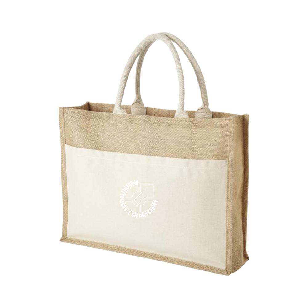 großes Hauptfach und eine Vordertasche. Die Tasche besteht aus Jute und Canvasa und ist dadurch langlebig und geeignet, um schwere Gegenstände im Hauptfach zu transportieren.